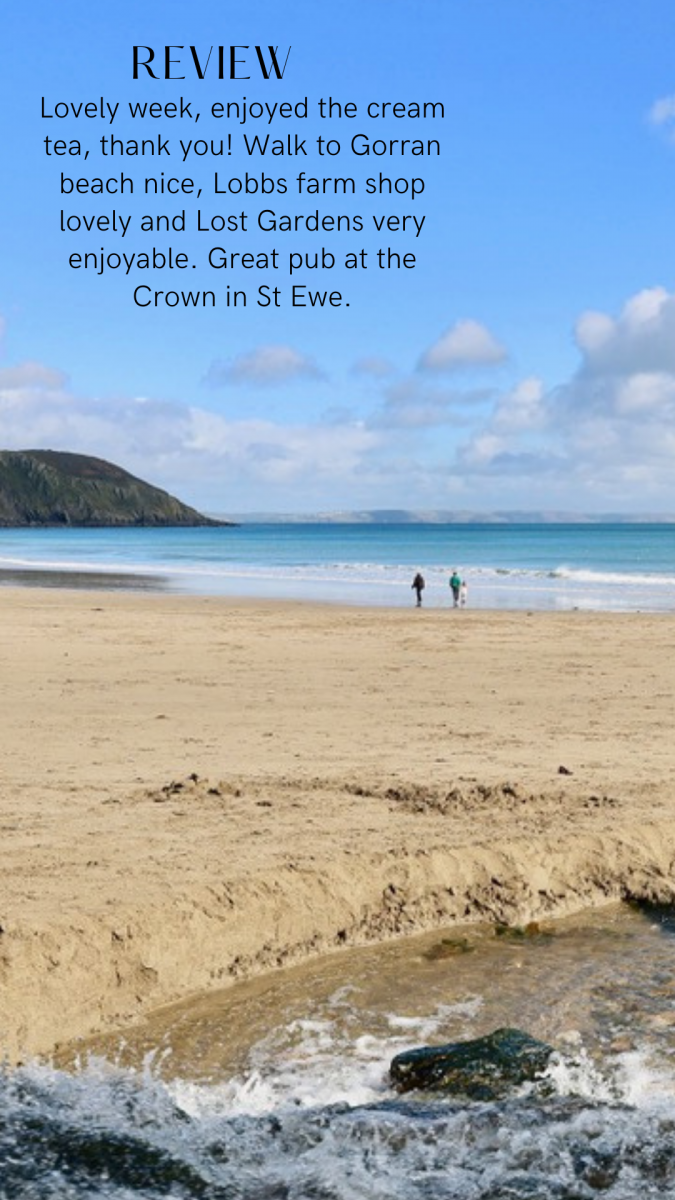 “Had a lovely stay, like previous comments would recommend the Barley Sheaf, but you need to book. Recommend Heligan Gardens and the beach at ‘Port Lunny’. Liked all the nice welcoming touches, helped the holiday to get off to a good start” –  P & C Families, Reading, Berkshire